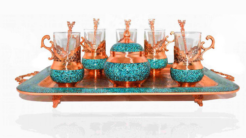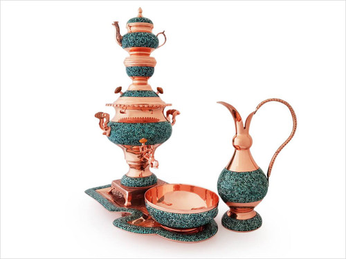 ست فیروزه کوبی - سماور، قوری، پارچ، کاسه، سینی